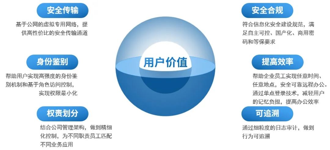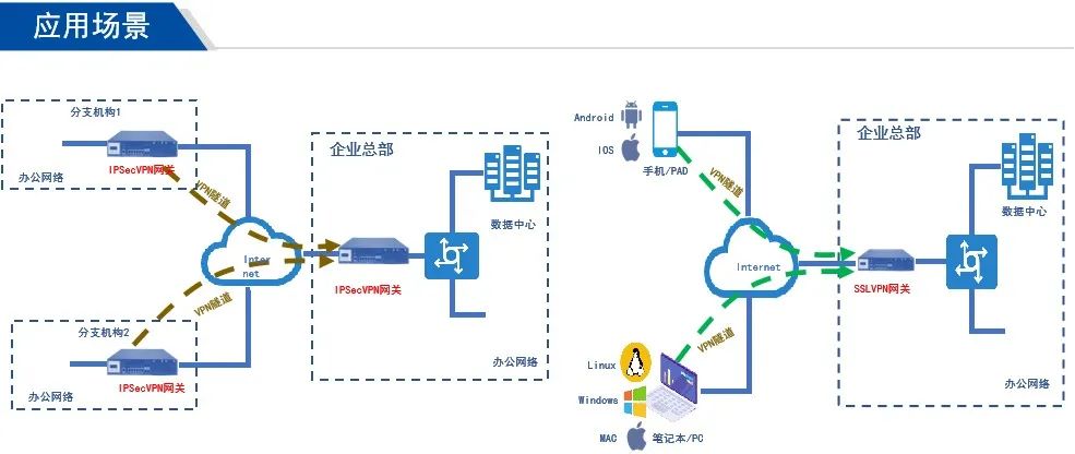 支持IPSEC/IKE协议、支持SSLVPN、基于环境的访问控制、基于主体(客体)属性的访问控制、防火墙和VPN的联动功能,带来全方位的传输保护;并通过隧道压缩、带宽管理、网间加速等技术实现高性能的通讯保障;方便灵活的SSLVPN支持多端接入、细颗粒度访问控制和互联隔离。
