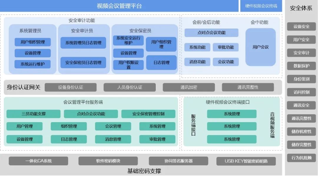 同时,随着部分视频会议安全标准的颁布实施,国家明确了特殊的网络环境下视频会议系统建设的基本要求以及视频会议系统中的视频会议管理系统、视频会议终端、多点控制单元类设备的产品安全保密技术和产品保证要求,需要为视频会议建立一个安全的网络环境,同时实现视频会议音视频信息的保密性、完整性,并完成身份鉴别以确保不可抵赖性。