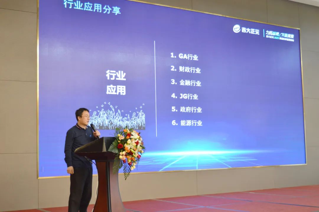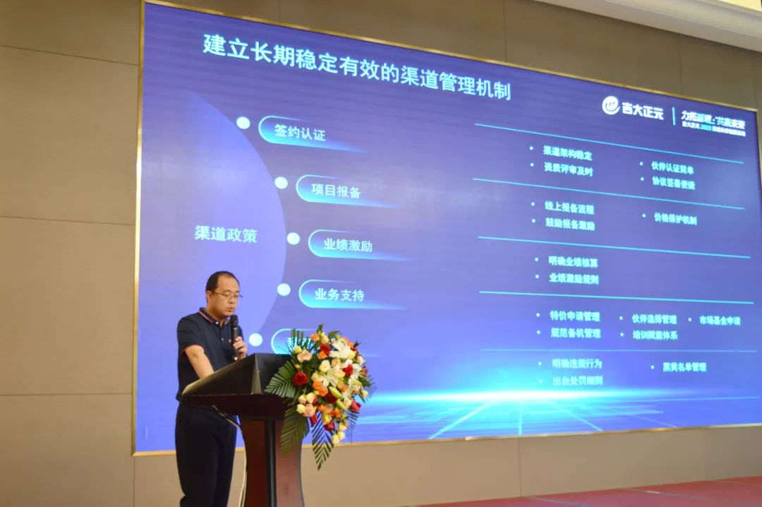 吉大正元内蒙古分公司总经理权基洪发表题为《夯基聚势共赴新程》的主题致辞,他详细为内蒙古的合作伙伴介绍了吉大正元的发展及目前取得的优秀成绩,同时表示希望与更多渠道伙伴建立良好合作关系,吉大正元也将在未来与合作伙伴们共创价值。