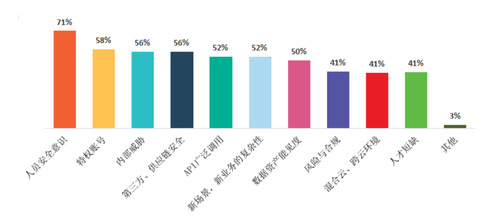 根据,GoUpSec《2022 年中国企业数据安全现状调查报告》以及信通院相关调查报告揭示,当前企业或组织面临的数据安全典型问题有:内部威胁、风险与合规、人员安全意识不足、数据资产能见度低、安全产品缺乏协同管理、数据安全的持续状态难以保持等。