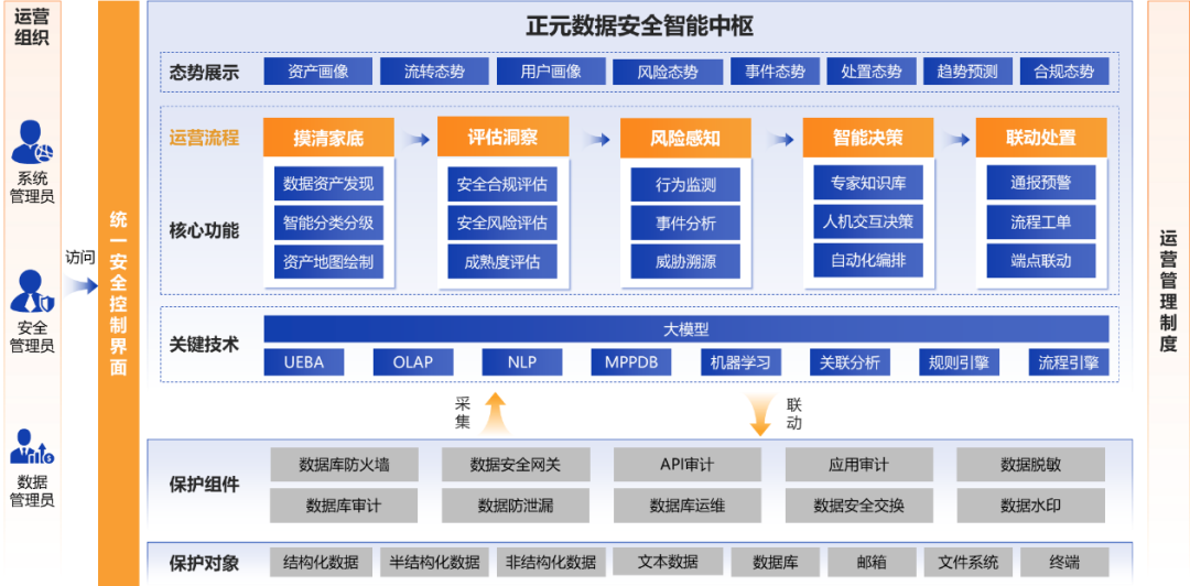 数据安全智能中枢作为吉大正元“安全数据港”整体方案的核心产品,其功能定位是一款数据安全综合管控平台,具备覆盖数据安全威胁事前、事中、事后的管控能力。