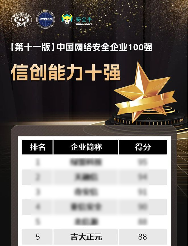 12月1日,国内网络安全媒体安全牛发布第十一版《中国网络安全企业100强》。在申报的300余家安全厂商中,长春吉大正元信息技术股份有限公司(简称:吉大正元股票代码:003029)以突出的综合能力以及核心竞争优势继续登榜,位列中国网络安全100强榜综合能力第17位,同时获得信创能力十强榜单第5名。