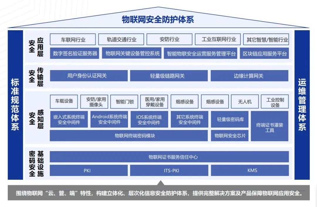 吉大正元以“物联网+安全”的产业构建为基础,集中优势资源,依托以“元安全”为核心的数字安全技术,从物联网基础设施的密码安全、链接万物的设备感知安全、网络连通及数据流转的传输安全、多场景下的应用安全四个层面出发,辅以标准规范体系和运维管理体系,围绕物联网“云、管、端”特性,构建立体化、层次化物联网安全防护体系,并提供完整的解决方案及产品保障,可有效应对物联网安全挑战。