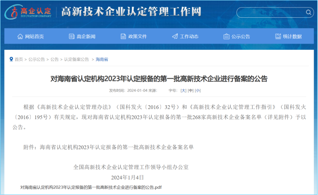 近日,全国高新技术企业认定管理工作领导小组办公室对外公布海南省认定机构2023年认定报备的第一批高新技术企业进行备案的公告名单,长春吉大正元信息技术股份有限公司(以下简称:吉大正元股票代码:003029)全资子公司海南正元星捷信息科技有限公司(以下简称海南正元星捷)成功上榜,通过本轮国家高新技术企业认定。