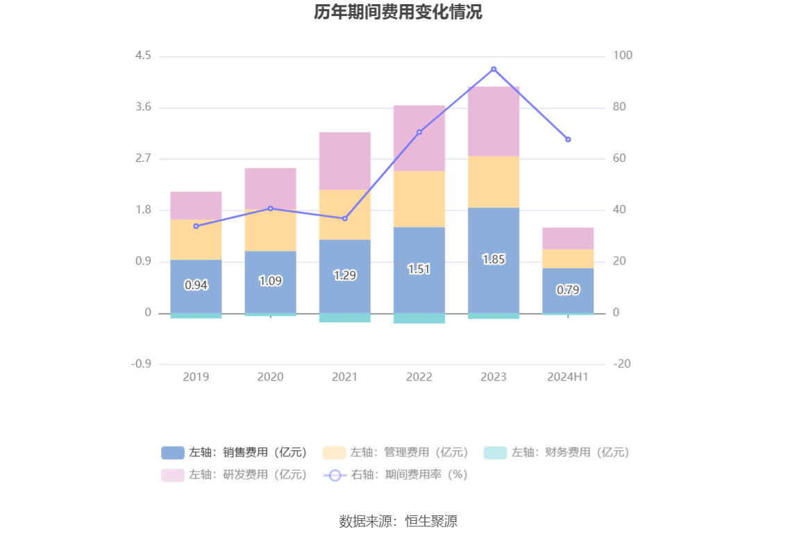 2024年上半年,公司期间费用为1.47亿元,较上年同期减少3290.76万元;期间费用率为67.64%,较上年同期下降0.93个百分点。其中,销售费用同比下降8.46%,管理费用同比下降30.4%,研发费用同比下降29.58%,财务费用由去年同期的-717.21万元变为-267.57万元。