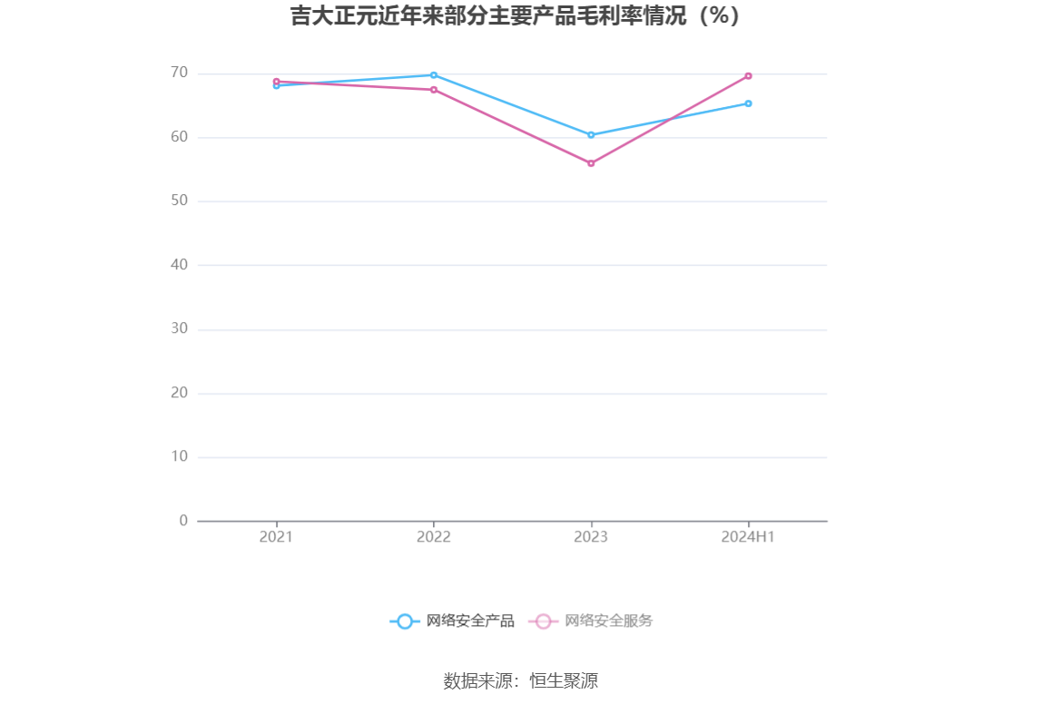 分产品看,网络安全产品、网络安全服务、网络安全生态2024年上半年毛利率分别为65.31%、69.62%、13.87%。