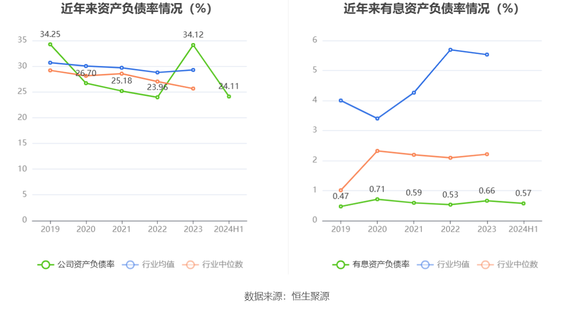 在偿债能力方面,公司2024年上半年末资产负债率为24.11%,相比上年末下降10.01个百分点;有息资产负债率为0.57%,相比上年末下降0.09个百分点。