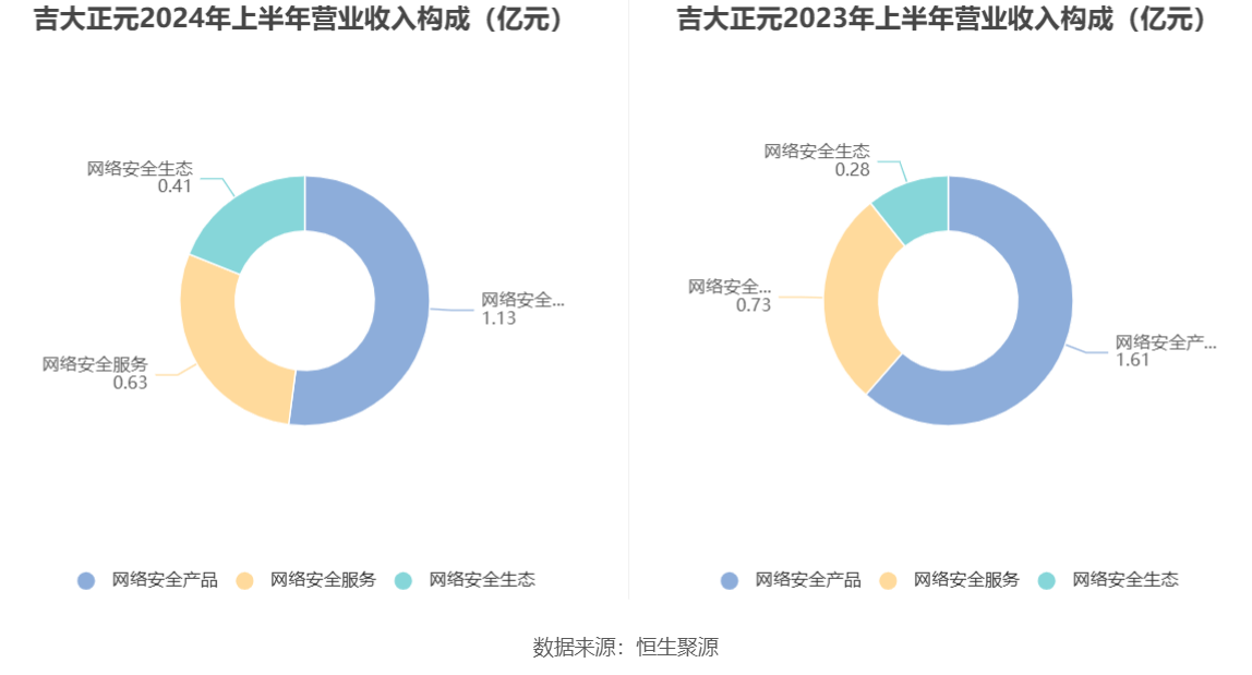 分产品来看,2024年上半年公司主营业务中,网络安全产品收入1.13亿元,同比下降29.94%,占营业收入的52.02%;网络安全服务收入0.63亿元,同比下降12.99%,占营业收入的29.20%;网络安全生态收入0.41亿元,同比增长45.00%,占营业收入的18.78%。