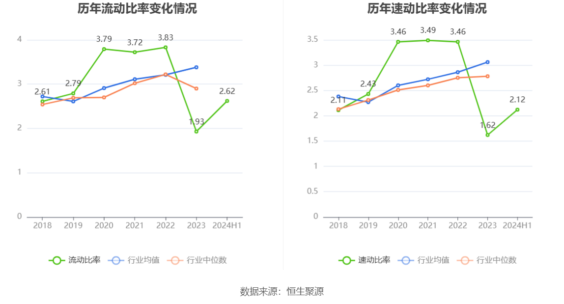 2024年上半年,公司流动比率为2.62,速动比率为2.12。