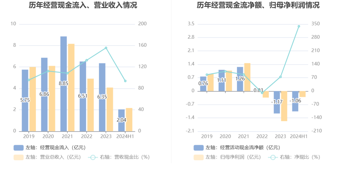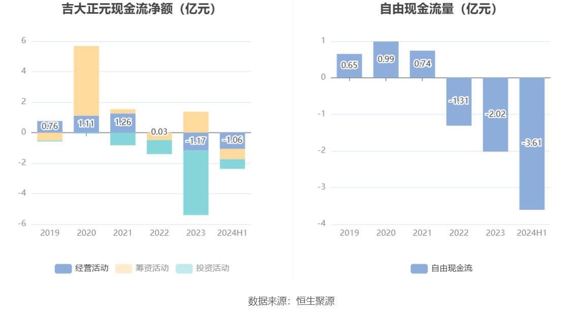 进一步统计发现,2024年上半年公司自由现金流为-3.61亿元,上年同期为-3.32亿元。