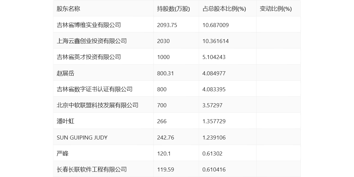 半年报显示,2024年上半年末公司十大流通股东中,新进股东为长春长联软件工程有限公司,取代了一季度末的国投高科技投资有限公司。在具体持股比例上,SUN GUIPING JUDY持股有所下降。