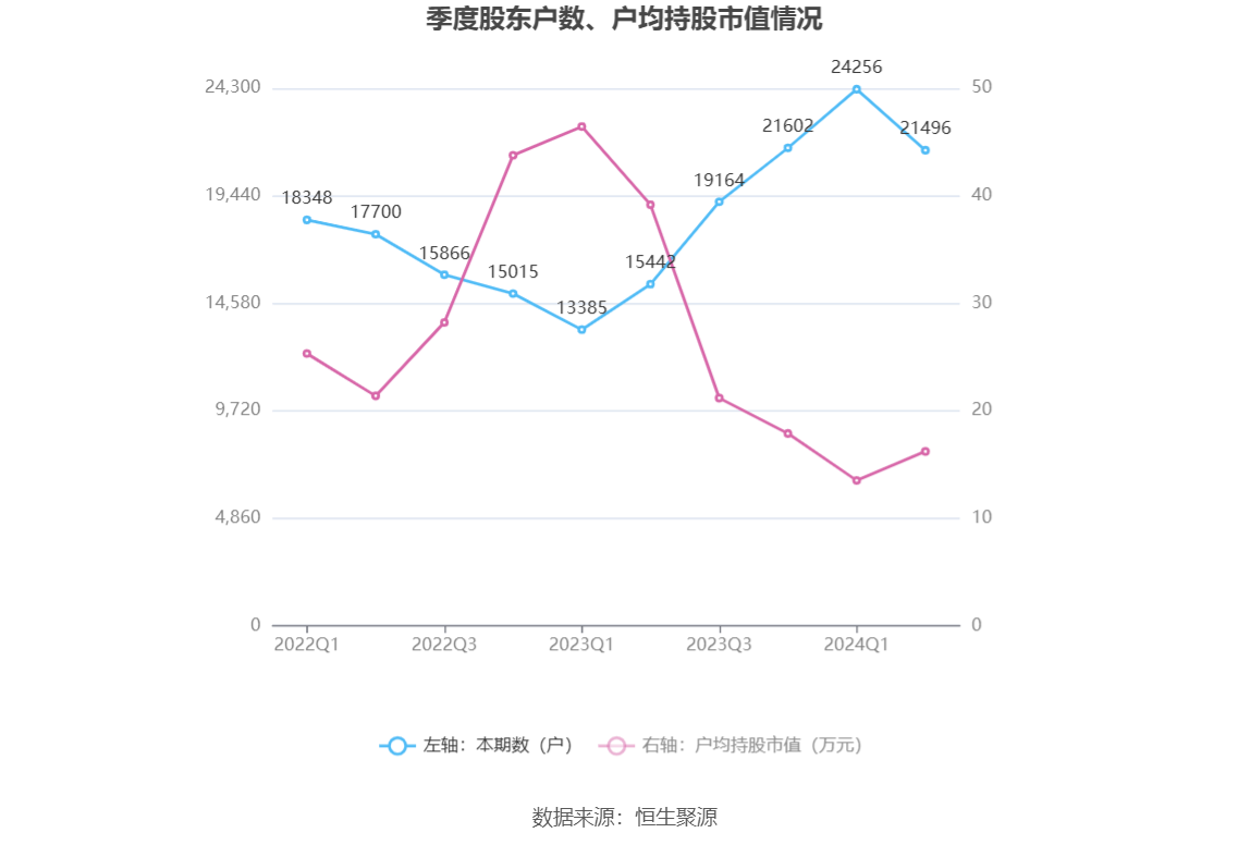 筹码集中度方面,截至2024年上半年末,公司股东总户数为2.15万户,较一季度末下降了2760户,降幅11.38%;户均持股市值由一季度末的13.51万元上升至16.21万元,增幅为19.99%。