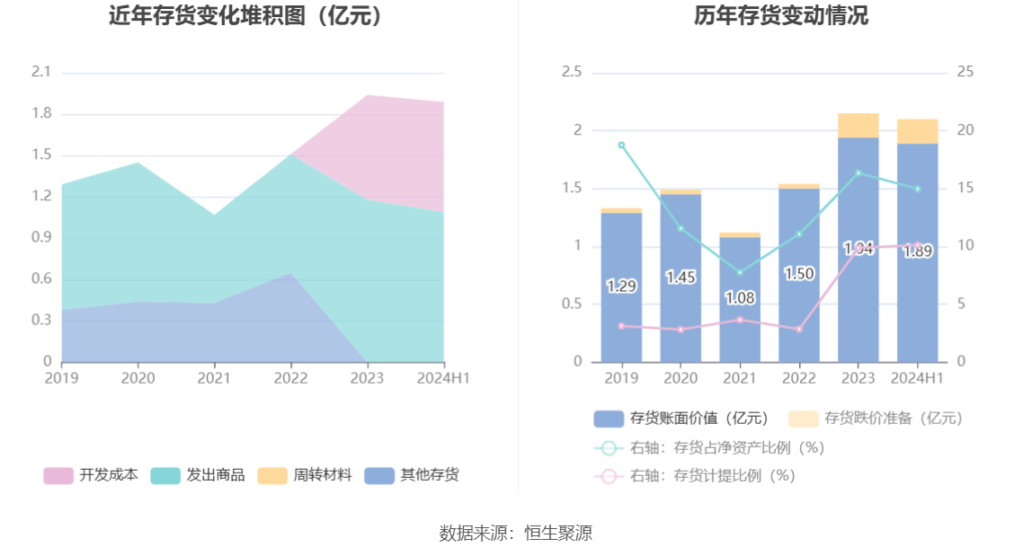 从存货变动来看,截至2024年上半年末,公司存货账面价值为1.89亿元,占净资产的14.97%,较上年末减少542.36万元。其中,存货跌价准备为2125.46万元,计提比例为10.13%。