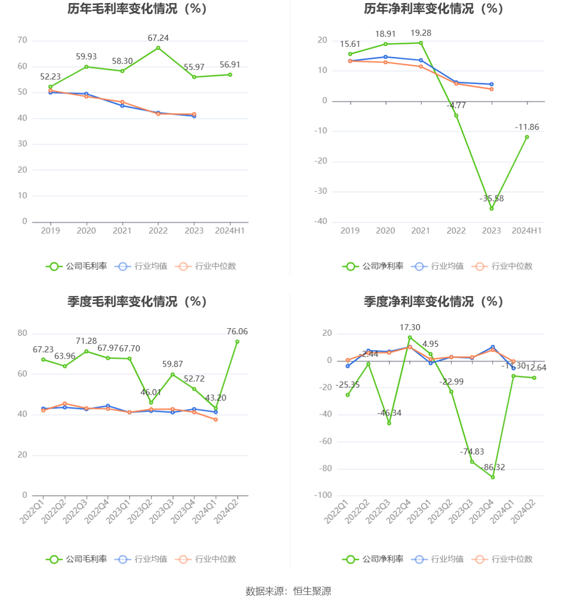 2024年上半年,公司毛利率为56.91%,同比上升0.80个百分点;净利率为-11.86%,较上年同期下降1.87个百分点。从单季度指标来看,2024年第二季度公司毛利率为76.06%,同比上升30.05个百分点,环比上升32.86个百分点;净利率为-12.64%,较上年同期上升10.35个百分点,较上一季度下降1.34个百分点。
