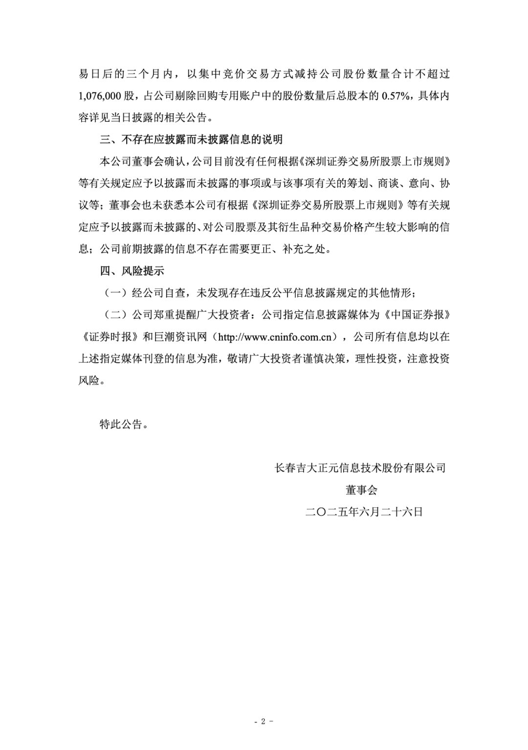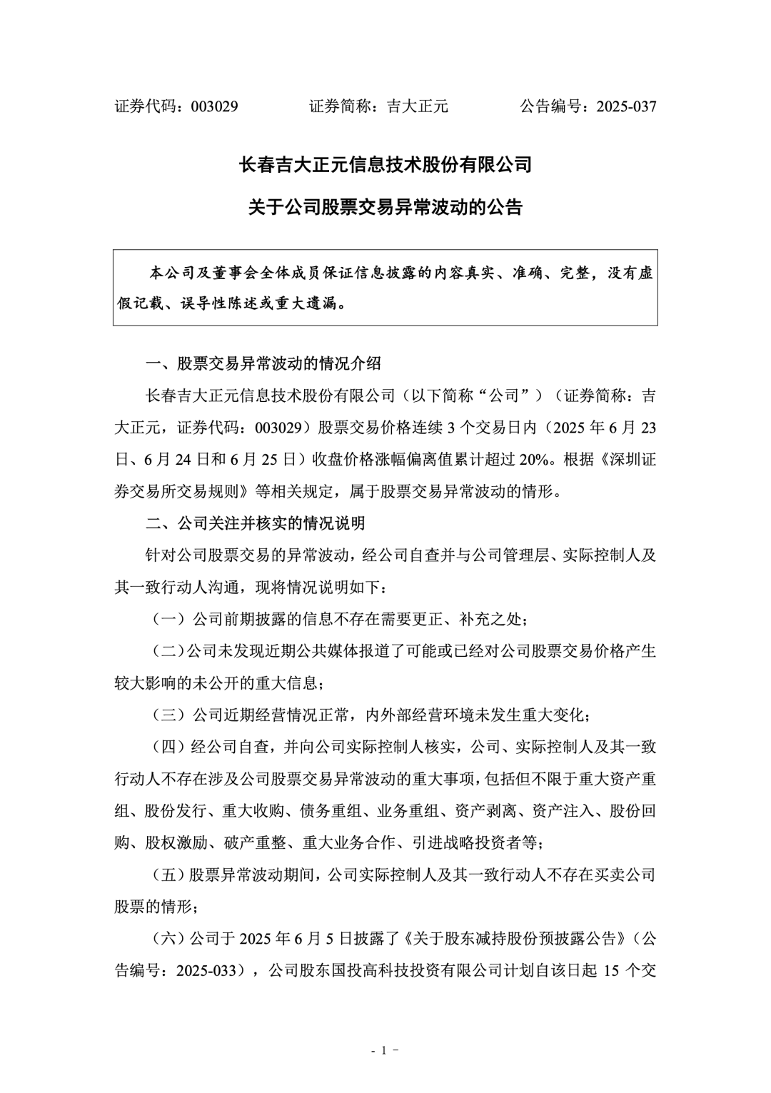 2025 年 6 月 26 日,长春吉大正元信息技术股份有限公司发布《关于公司股票交易异常波动的公告》。