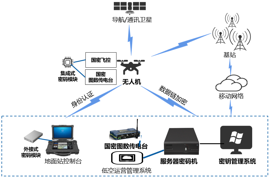 采用SM2、SM4等国家商用密码算法,为无人机与地面站、云端平台之间的通信提供全链路加密保护,有效抵御指令篡改与数据窃听,确保数据传输的机密性与完整性。