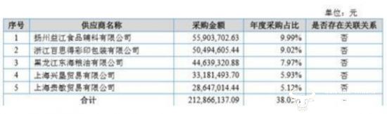 据招股书显示,2016年祖名股份对当年前五大供应商的采购额分别为5,000.60万元、4,339.99万元、3,916.84万元、2,937.65万元和2,535.34万元,而同期年报数据则显示的是5590万元、5049万元、4464万元、3318万元、2865万元,明显年报当中的数据高于招股书中的数据。