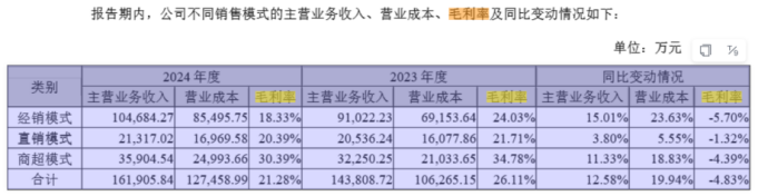 值得注意,虽然经销模式收入规模总体呈现增长态势,但该模式的毛利率却从2020年31.02%的毛利率一路下滑至2024年仅剩18.33%。
