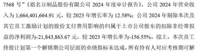 豆制品生产商祖名股份(003030.SZ)近期发布的2024年年报显示,公司实现营收16.64亿元,同比增长12.58%,归母净利润亏损2513.61万元,同比大幅下降162.12%,这是公司自2021年上市后首次盈利告负。这也意味着,祖名股份于2024年4月推出的员工持股计划中,第一个解锁期公司层面的业绩指标未达成。