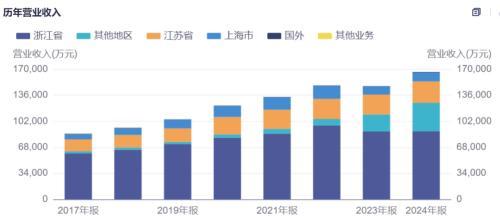 近年,祖名股份加快了浙江省外市场开拓步伐,2024年浙江省外市场营收刚好是2017年的三倍,同时浙江省内营收占比从2017年的69.71%下降至2024年的53.54%。除了原有的杭州和安吉两大浙江省内生产基地,公司还投资建设了扬州、南京、贵州、山西、河北等生产基地。