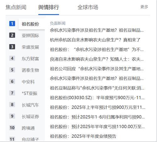 祖名豆制品股份有限公司(简称“祖名股份”,证券代码:003030.SZ)近期深陷舆论风暴,在同花顺舆情监测系统中高居负面舆情榜首,成为资本市场关注的焦点。一方面,公司因“余杭水污染事件”被卷入舆论漩涡;另一方面,半年度业绩预亏公告显示公司的业绩困境正在加剧,可谓“屋漏偏逢连夜雨”。