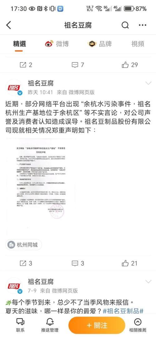 舆论发酵一段时间后,7月19日上午,祖名股份在其官方微博“祖名豆腐”发布声明:公司在杭州的生产基地并非网传的余杭区仁和街道,而是设立于滨江区。公司在余杭区从未有任何生产基地,在杭州地区的生产、用水活动与余杭区无任何关系,与网传所谓“余杭水污染事件”也无任何关联。