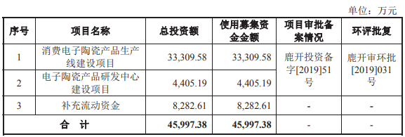 中瓷电子本次公开发行募集资金扣除发行费用后拟投资于消费电子陶瓷产品生产线建设项目、电子陶瓷产品研发中心建设项目以及补充流动资金。