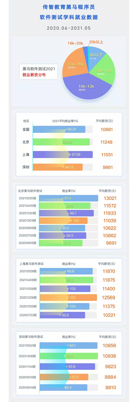 而从传智教育软件测试学科近一年一线城市的就业数据来看,软件测试学科的就业率及就业薪资更是呈现持续同步上涨趋势。