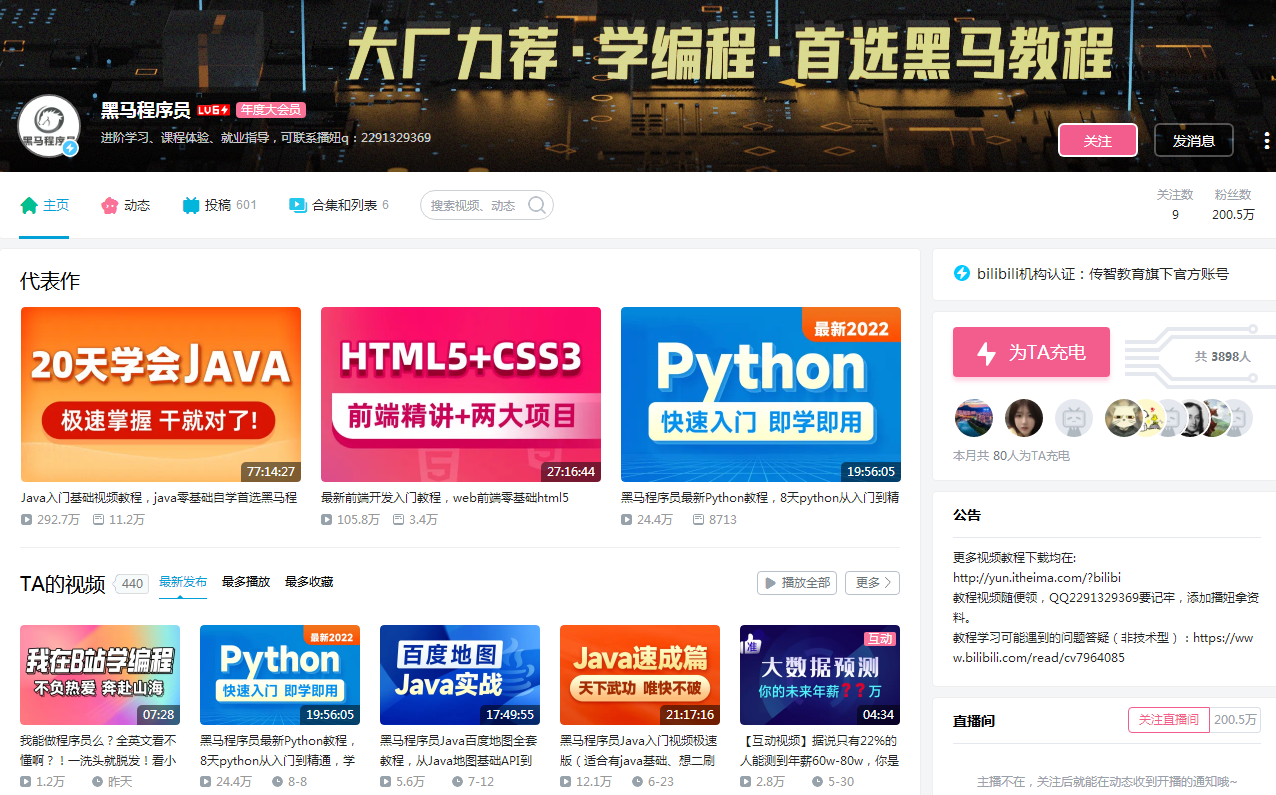 从传智教育旗下黑马程序员的官方公众号获悉,在2022年8月23日,传智教育旗下高端IT教育品牌黑马程序员在哔哩哔哩(简称B站)的官方账号粉丝突破200万。