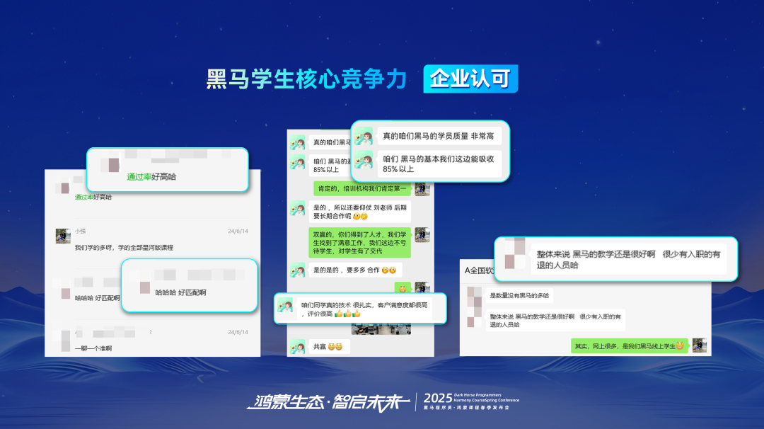 发布会现场,邀请了用人企业解读企业用人标准、薪资趋势及行业发展前景,同时邀请了两位黑马老学员分享求职心得和从事鸿蒙开发的工作感悟。