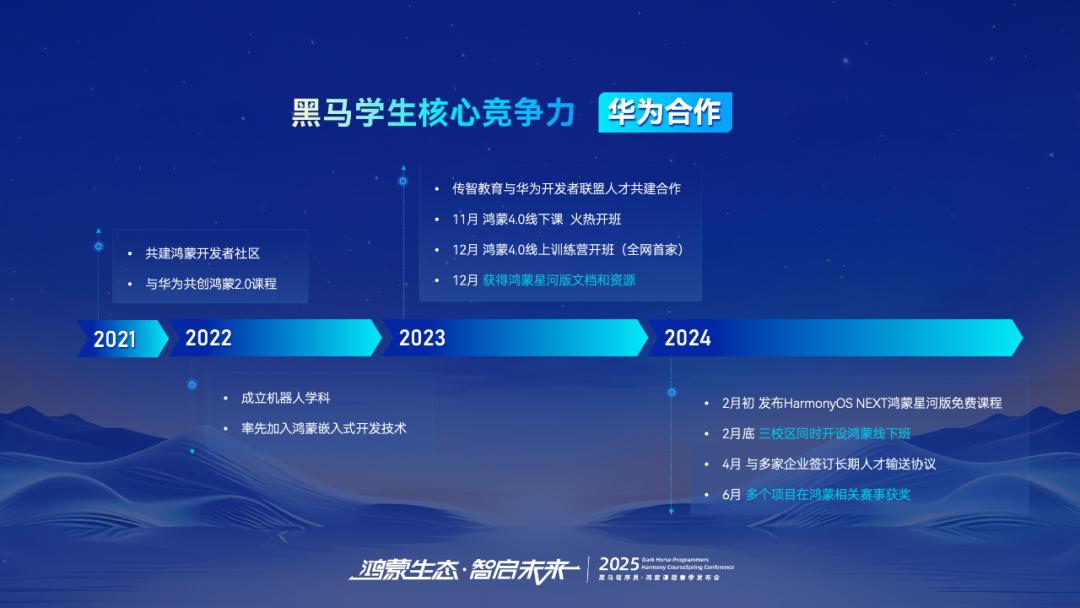 传智教育和华为的合作由来已久,自2021年起,双方陆续共建鸿蒙开发者社区、共创鸿蒙2.0课程。2024年初发布HarmonyOS NEXT鸿蒙星河版免费课程,并在多校区开设鸿蒙线下班。