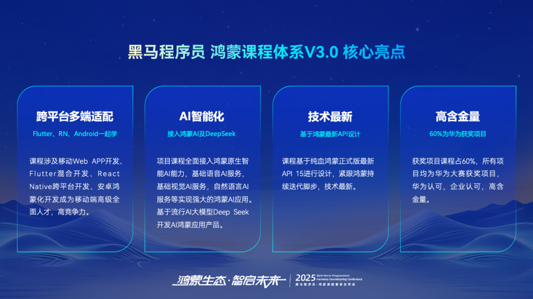 为确保学员所学技术紧跟行业前沿,黑马鸿蒙V3.0版课程体系是基于纯血鸿蒙正式版最新API15进行设计,其核心亮点包括跨平台多端适配、接入鸿蒙AI及DeepSeekAI智能化、项目课程高含金量等。