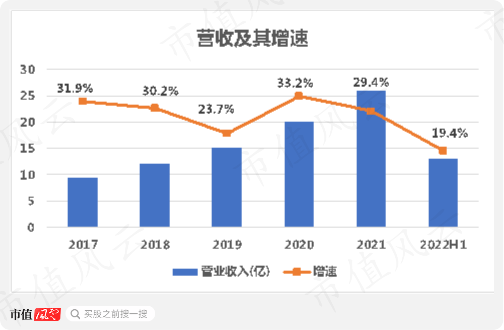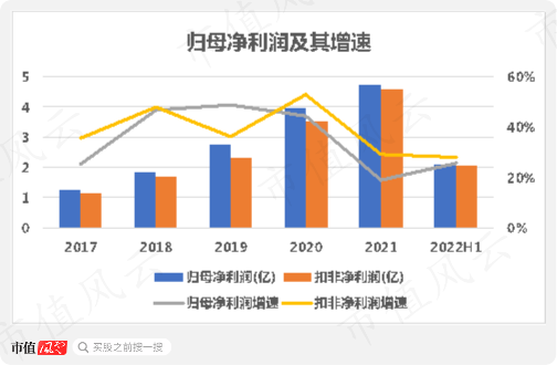 公司2021年归母净利润为4.7亿,2017-21年CAGR为39%,高于营收增速。2022年上半年为2.1亿,同比增速为25.6%。