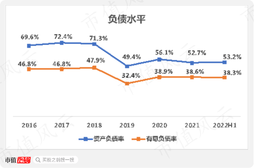 近几年公司负债水平有改善,但2022年上半年仍为53.2%,同期有息负债率也高达38.3%。