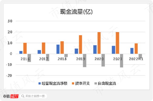 2016-21年,公司自由现金流历年为负,其通过经营活动共产生了38.8亿现金流,支出97.2亿资本开支,最终自由现金流净流出约58.3亿。