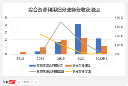 生物质综合利用业务起步虽晚,但增速较快,2021年营收4.1亿,2019-21年复合增长率高达229%。农光互补业务营收占比不足10%,2022年上半年营收为1.1亿,同比增速为9%,水平较低。