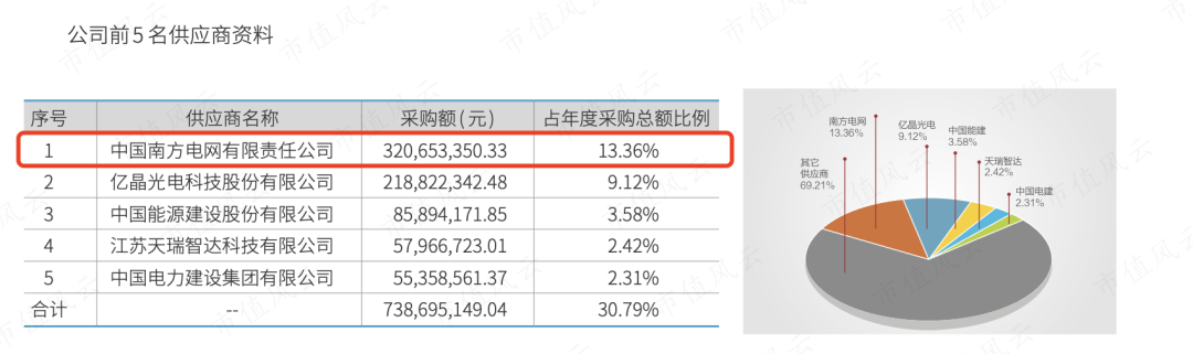 2021年前5大供应商名单上,南方电网也是排名第一,公司向其采购3.2亿,占总采购额的13.3%,过去几年该比例也均超10%。