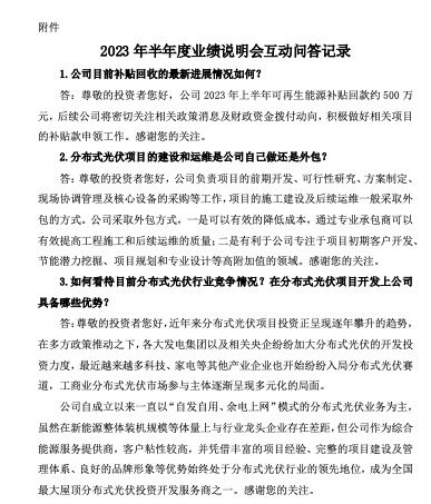 答:公司积极探索业务内涵式增长和外延式拓展的方向、策略和实践路径,进一步明确,一是聚焦成熟业务做规模,做优做强节能、分布式光伏等业务,抢抓国家“千乡万村驭风行动”发展机遇、加快分散式风电业务布局,积极实施多种应用模式的大型新能源资源综合利用项目,例如公司正在与广东交通实业投资有限公司推进的高速公路分布式光伏项目。