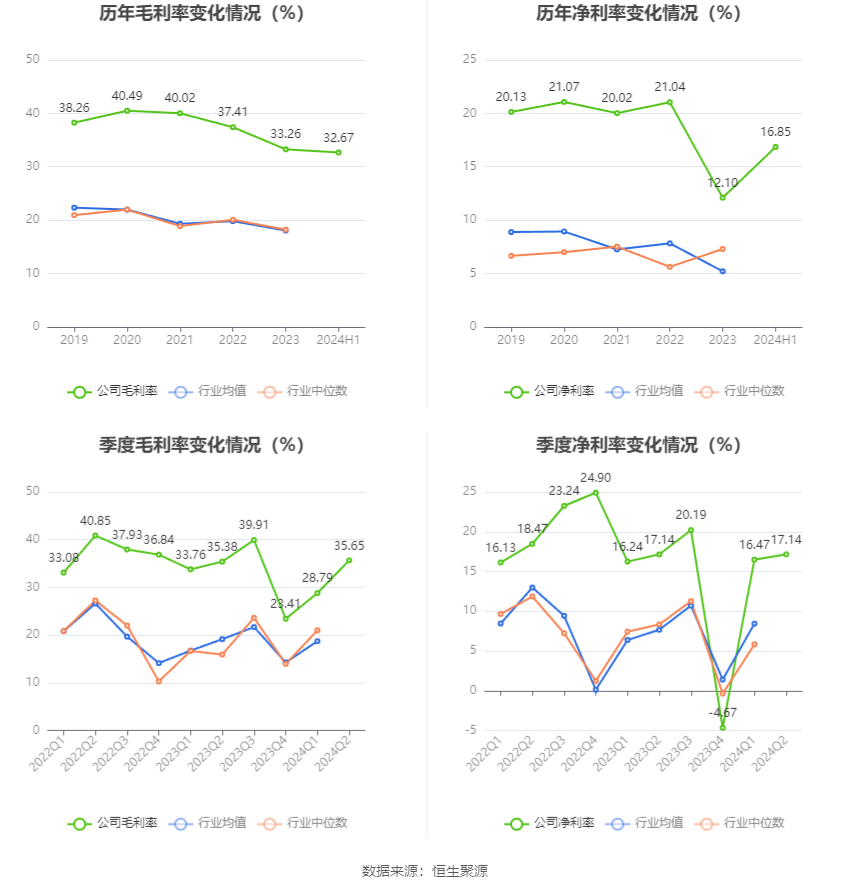 2024年上半年,公司毛利率为32.67%,同比下降2.03个百分点;净利率为16.85%,较上年同期上升0.08个百分点。从单季度指标来看,2024年第二季度公司毛利率为35.65%,同比上升0.27个百分点,环比上升6.86个百分点;净利率为17.14%,较上年同期持平,较上一季度上升0.67个百分点。