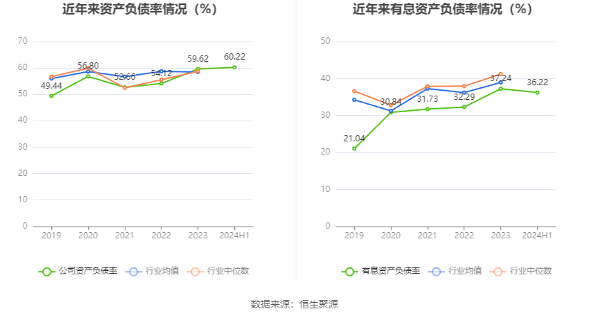 在偿债能力方面,公司2024年上半年末资产负债率为60.22%,相比上年末上升0.60个百分点;有息资产负债率为36.22%,相比上年末下降1.02个百分点。