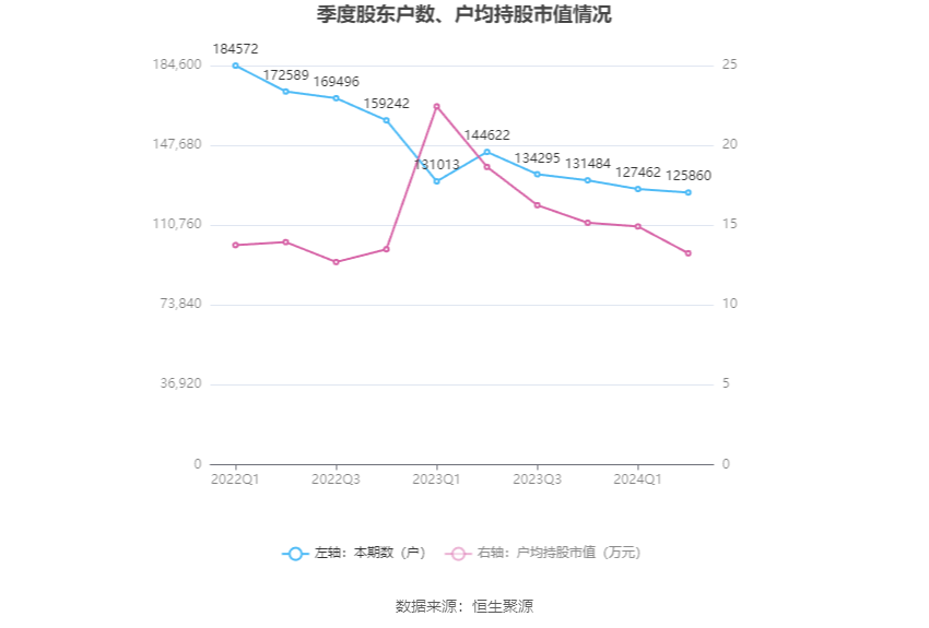 筹码集中度方面,截至2024年上半年末,公司股东总户数为12.59万户,较一季度末下降了1602户,降幅1.26%;户均持股市值由一季度末的14.92万元下降至13.24万元,降幅为11.26%。