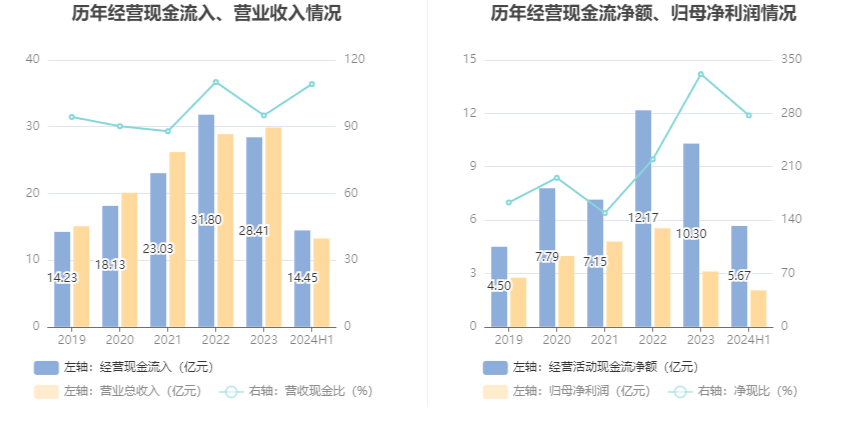 2024年上半年,公司营业收入现金比为109.15%,净现比为277.29%。
