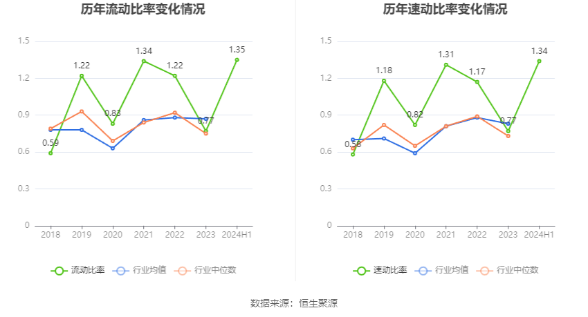 2024年上半年,公司流动比率为1.35,速动比率为1.34。