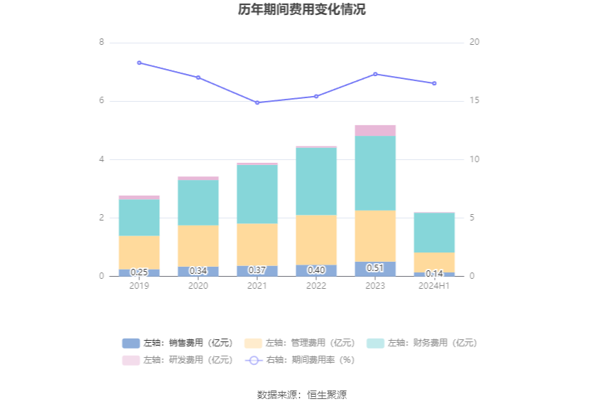 2024年上半年,公司期间费用为2.19亿元,较上年同期增加560.71万元;期间费用率为16.52%,较上年同期上升0.17个百分点。其中,销售费用同比下降28.75%,管理费用同比下降14.39%,研发费用同比增长59.59%,财务费用同比增长19.04%。