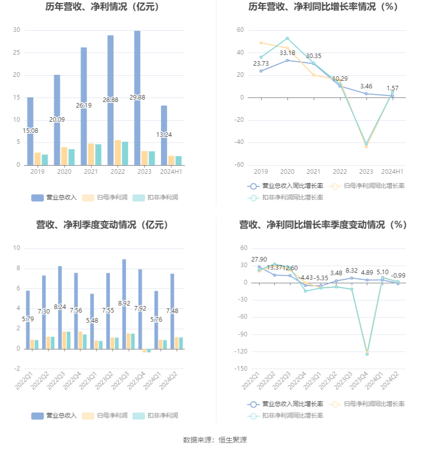 根据半年报,公司第二季度实现营业总收入7.48亿元,同比下降0.99%,环比增长29.91%;归母净利润1.15亿元,同比增长2.15%,环比增长27.66%;扣非净利润1.13亿元,同比增长1.87%,环比增长32.27%。