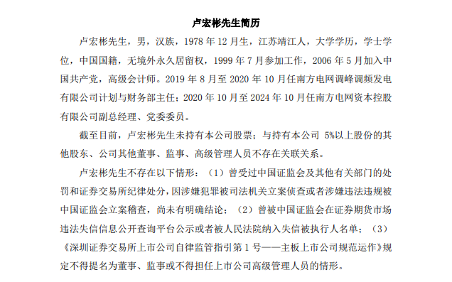 卢宏彬先生,男,汉族,1978年12月生,江苏靖江人。1999年7月参加工作,2006年5月加入中国共产党,高级会计师。2019年8月至2020年10月南方电网调峰调频发电有限公司计划与财务部主任;2020年10月至2024年10月任南方电网资本控股有限公司副总经理、党委委员。