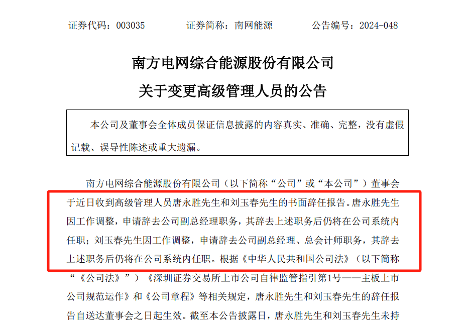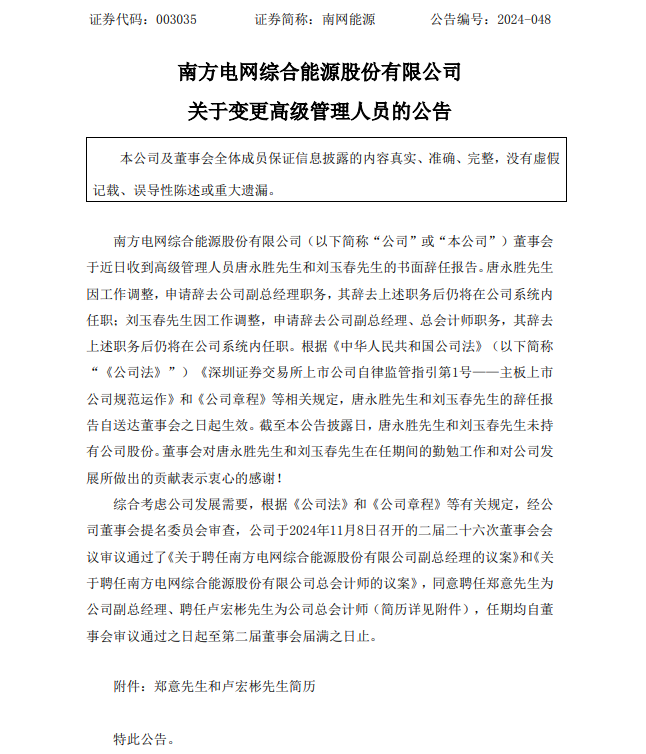 11月9日,南网能源发布公告称,董事会于近日收到高级管理人员唐永胜先生和刘玉春先生的书面辞任报告。