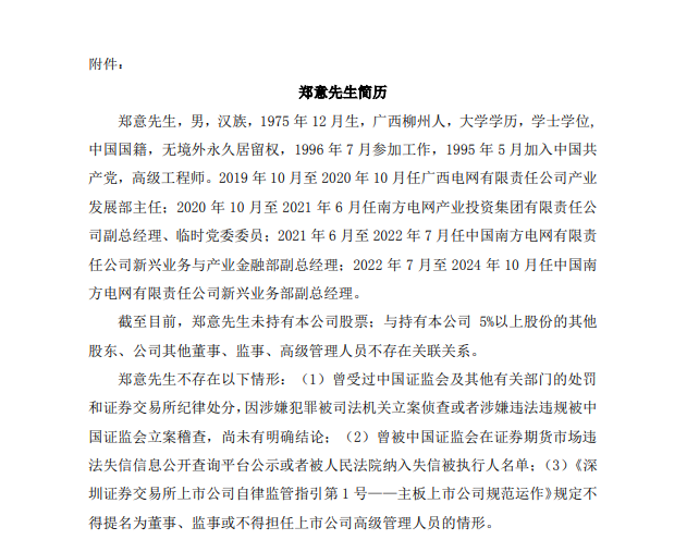 郑意先生,男,汉族,1975年12月生,广西柳州人。1996年7月参加工作,1995年5月加入中国共产党,高级工程师。2019年10月至2020年10月任广西电网有限责任公司产业发展部主任;2020年10月至2021年6月南方电网产业投资集团有限责任公司副总经理、临时党委委员:2021年6月至2022年7月任中国南方电网有限责任公司新兴业务与产业金融部副总经理;2022年7月至2024年10月任中国南方电网有限责任公司新兴业务部副总经理。
