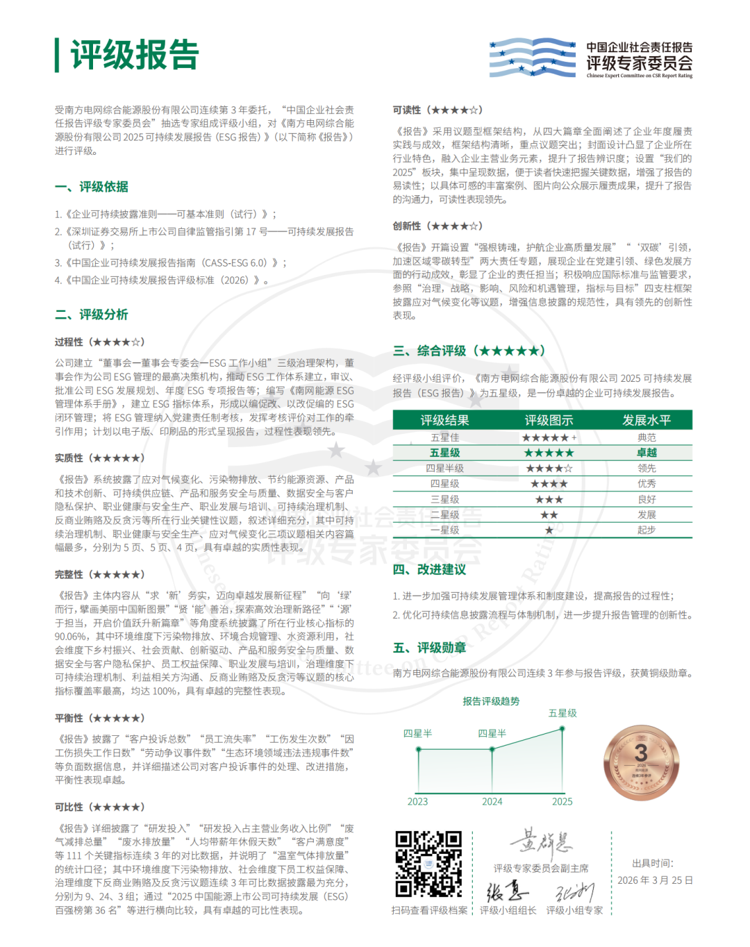 近日,南网能源公司2025年可持续发展报告(ESG报告)荣获中国企业社会责任报告评级专家委员会“五星级(卓越)”评价。这是公司第三次参与评级,在此前两次获评“四星半”基础上实现新突破,首次跻身五星行列。