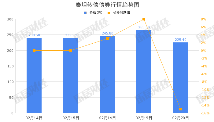 乐居财经 02月21日,“泰坦转债”(127096)早盘拉低,截至11:10,跌幅10.49%,报201.75元。总成交量24.63万手,成交额5.09亿元。